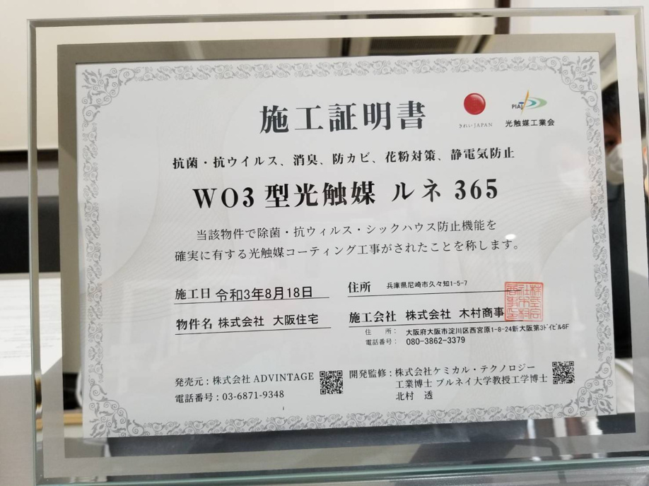 全ての箇所を施行していただき、無事に光触媒コーティングが終わったことを意味する「施行証明証」を発行してもらいました。