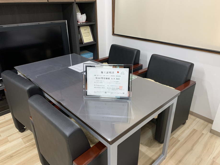 入り口・応接間・デスク・窓・取っ手・備品類・キッチン・社用車と、人の出入りがあるところは全て施行していただいたので、これで感染症対策のレベルが上がったのではないかと思います!